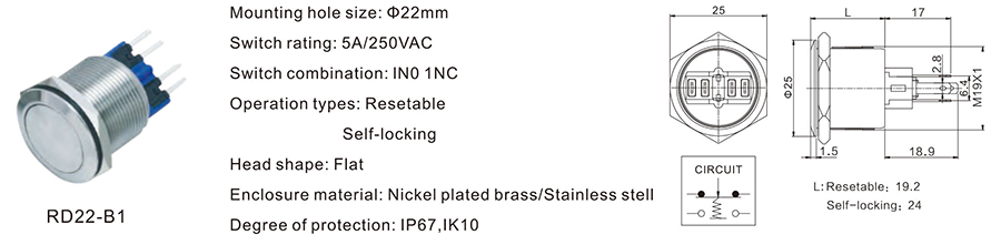 金屬開關(guān) | RD22-F3 | 250VDC | 5A | / | / | ≥100,000 CYCLES | 立即申請 | 下載 |