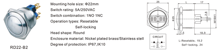 金屬開關 | RD22-G2 | 250VDC | 5A | / | / | ≥100,000 CYCLES | 立即申請 | 下載 |