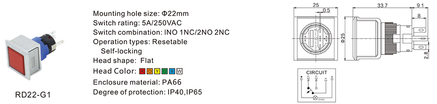 22MM金屬開關(guān)RD22-G3 金屬開關(guān) RD22-G3 250VDC 5A / / ≥100,000 CYCLES 立即申請 下載