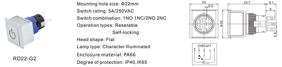 金屬開關(guān) | RD22-G2 | 250VDC | 5A | / | / | ≥100,000 CYCLES | 立即申請 | 下載 |