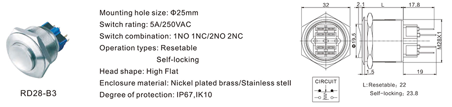 金屬開關(guān) | RD28-B3 | 250VDC | 5A | / | / | ≥100,000 CYCLES | 立即申請(qǐng) | 下載 |