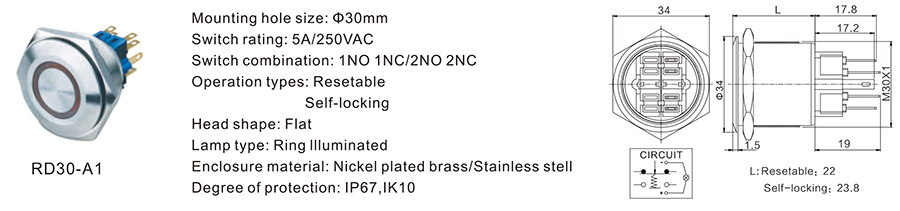 30MM金屬開關(guān)RD30-A1 金屬開關(guān) RD30-A1 250VDC 5A / / ≥100,000 CYCLES 立即申請 下載