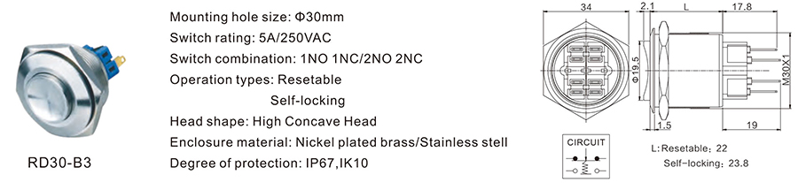 金屬開關(guān) | RD30-B3 | 250VDC | 5A | / | / | ≥100,000 CYCLES | 立即申請 | 下載 |