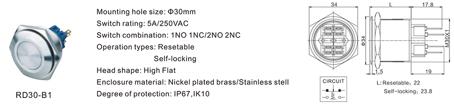 金屬開關(guān) | RD30-B3 | 250VDC | 5A | / | / | ≥100,000 CYCLES | 立即申請 | 下載 |