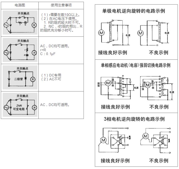 感性負(fù)載(繼電器、螺線管、蜂鳴器等)的情況下,會(huì)產(chǎn)生逆起電勢(shì)所引起的電弧,可能會(huì)引發(fā)觸點(diǎn)故障,因此建議插入適當(dāng)?shù)幕鸹ㄏ娐?參照下圖)。