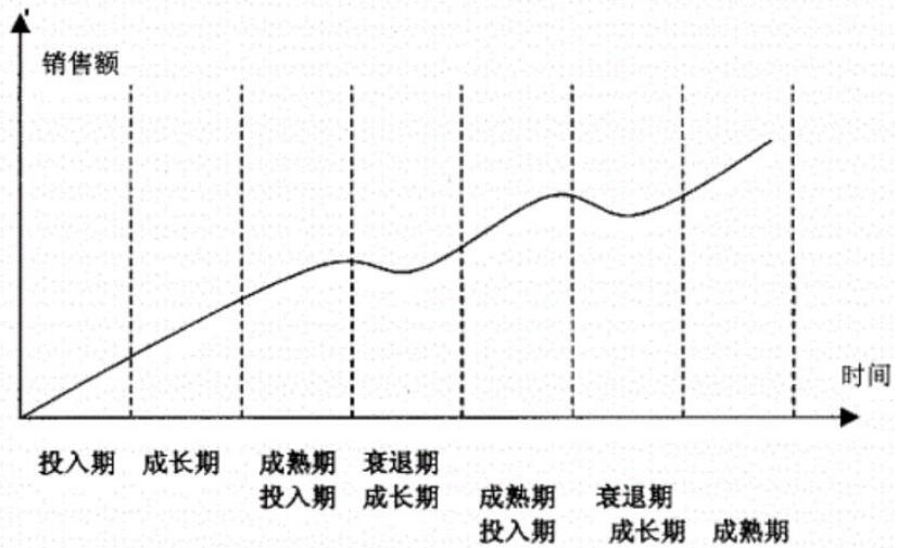一般情況下在相對(duì)低端產(chǎn)品處于成熟期的階段,就會(huì)有廠商推出相對(duì)高端的產(chǎn)品。這樣就推動(dòng)了產(chǎn)品的更新?lián)Q代,又帶來-輪新的產(chǎn)品生命周期。見圖1-2。