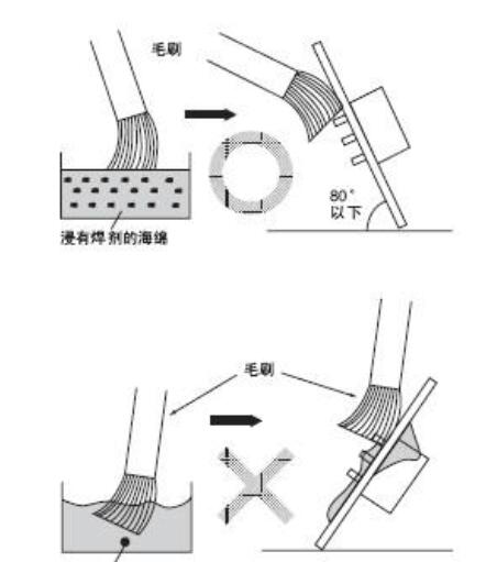 ●用毛刷涂助焊劑時,請使用浸透焊劑的海棉適量涂布。請注意基板不要傾斜到80°以上,以免焊劑流到開關(guān)安裝面。