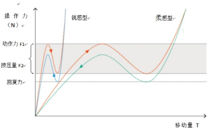 在同一操作力情況下,行程長時(shí)觸感柔軟順滑,行程短時(shí)觸感敏銳迅捷。即使是同一行程,按壓率發(fā)生變化時(shí)手指感受到的觸感也會(huì)發(fā)生變化(普遍認(rèn)為40%~60%為佳)。